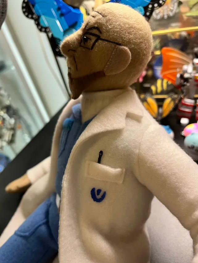 The seller captured Rusty's likeness perfectly and the attention to detail on his outfit was such a lovely touch. She even included the pen in his labcoat's pocket from the reference collage I provided. He also turned out much larger than I expected, and despite his size, is such a welcome addition to my assigned shitbug shelf.